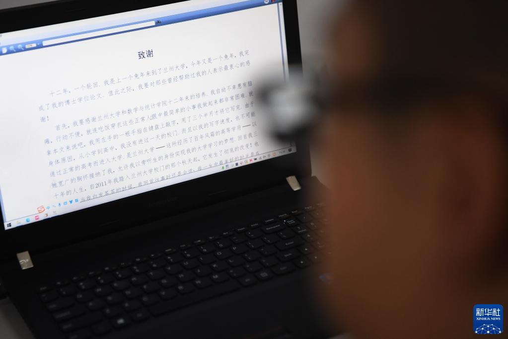 謝炎廷在蘭州大學(xué)理工樓的自習室里修改自己的“畢業(yè)論文”致謝部分(5月10日攝)。新華社記者 陳斌 攝