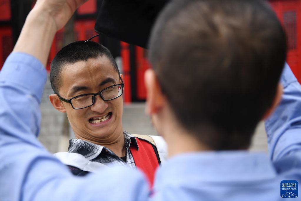 謝炎廷和同學(xué)在蘭州大學(xué)校園里準備拍“畢業(yè)照”留念(5月10攝)。新華社記者 陳斌 攝