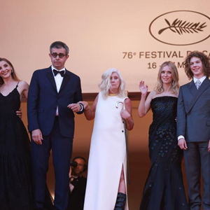 5月25日,在法國戛納舉行的第76屆戛納國際電影節上,法國導演凱瑟琳·布雷亞(右三)攜主創(chuàng )踏上影片《去年夏天》首映禮紅毯。
