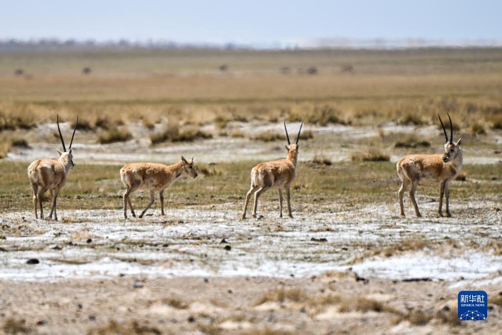 四只藏羚羊在阿爾金山國家級自然保護區覓食(5月23日攝)。