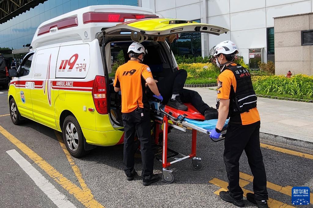 5月26日,在韓國大邱機場(chǎng),救援人員用擔架將出現呼吸困難的乘客轉移到救護車(chē)上。