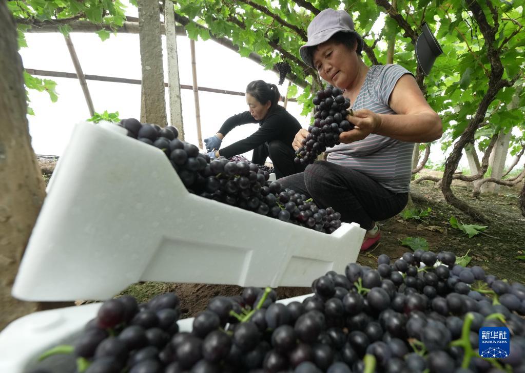 5月26日,唐山市海港經(jīng)濟開(kāi)發(fā)區王灘鎮趙灘村農民將采摘的葡萄裝箱。