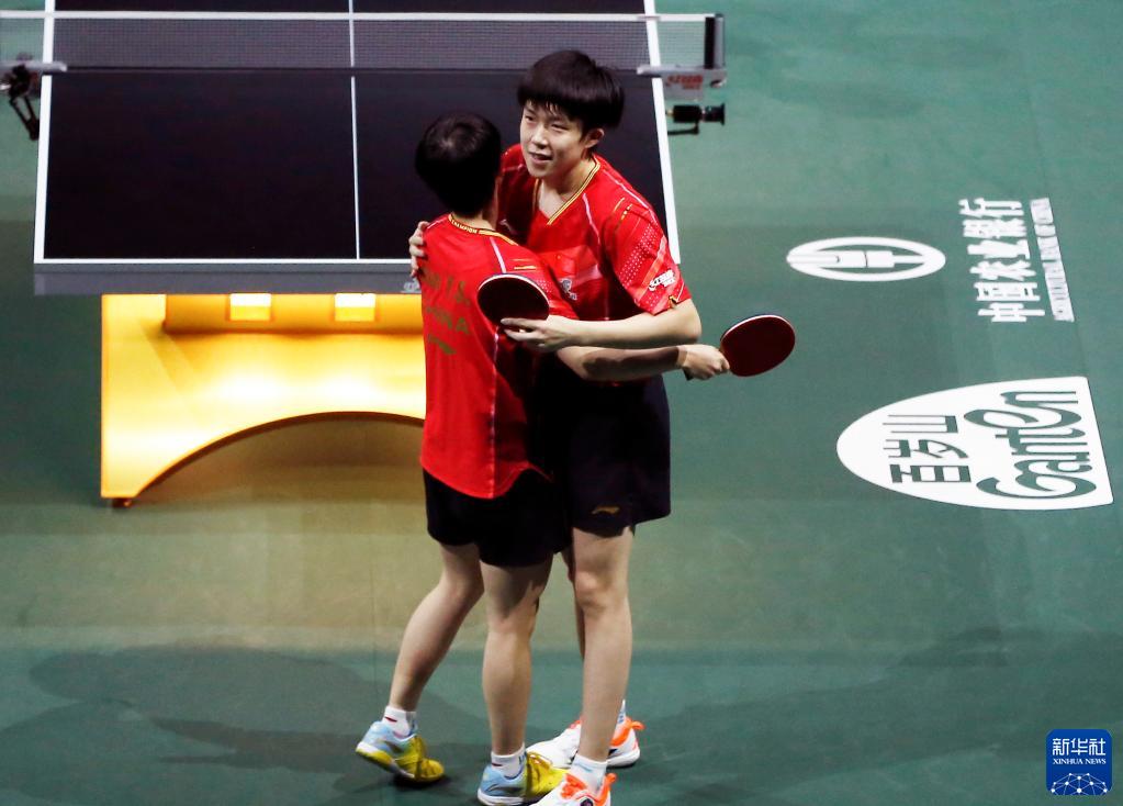 5月26日,王楚欽(右)/孫穎莎慶祝奪冠。