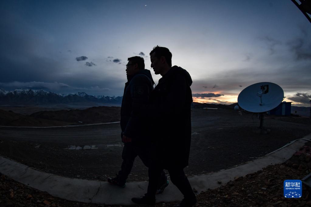尤顯龍(右)和同事唐鵬前往需要調試的望遠鏡塔臺處(5月23日攝)。