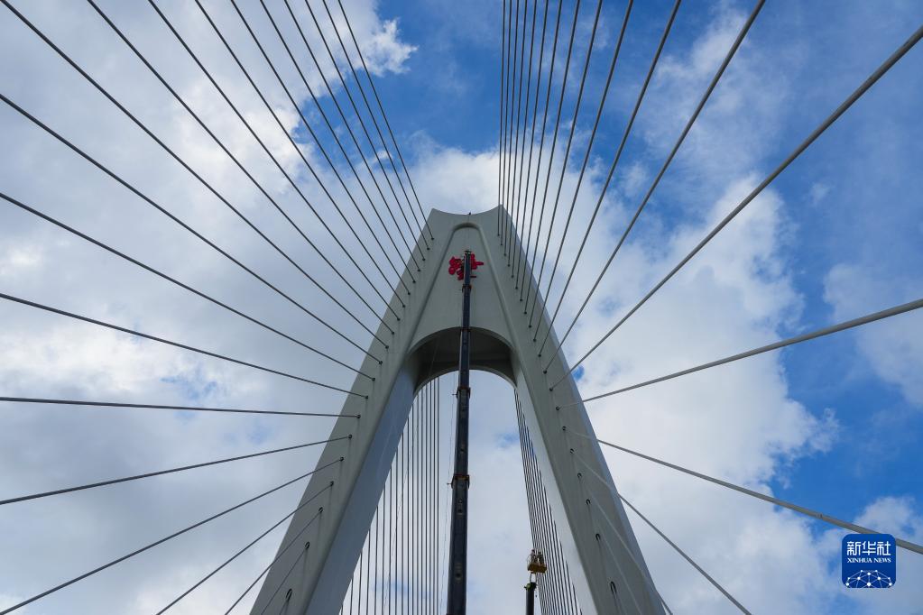 5月25日,工人在鷺洲大橋橋塔上吊裝大橋名字。