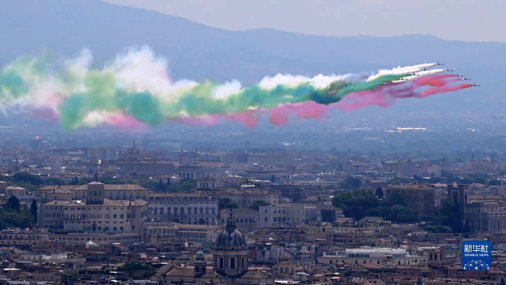 6月2日,意大利“三色箭”特技飛行表演隊在羅馬參加共和國日慶祝儀式。