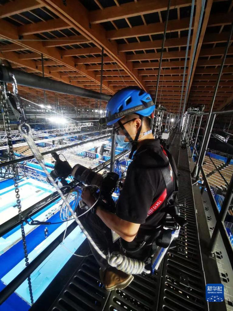 圖為新華社記者在東京奧運會(huì )體操中心的馬道上安裝高點(diǎn)位遙控相機(2021年7月6日攝)。