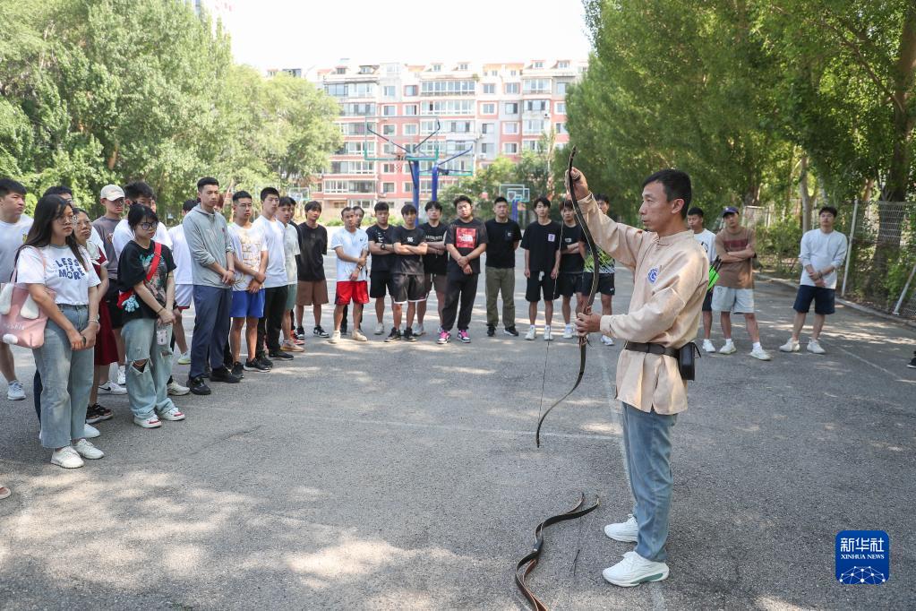 6月15日,沈陽(yáng)市非物質(zhì)文化遺產(chǎn)項目——錫伯族弓箭傳統制作技藝的傳承人鄂建燁在沈陽(yáng)師范大學(xué)為學(xué)生講解傳統弓箭相關(guān)知識。