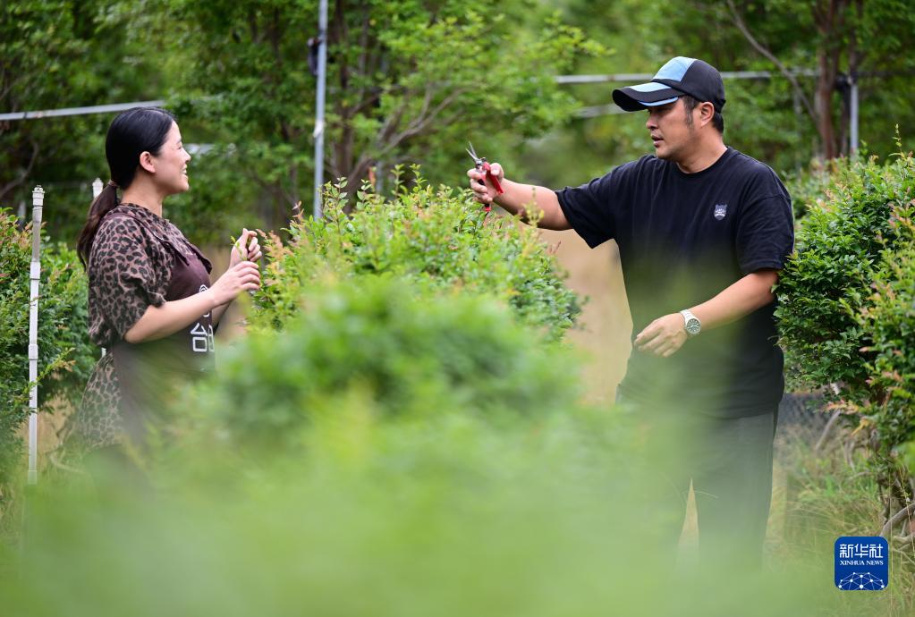 陳正信在教愛(ài)人葉麗清(左)修剪嘉寶果果苗(6月13日攝)。