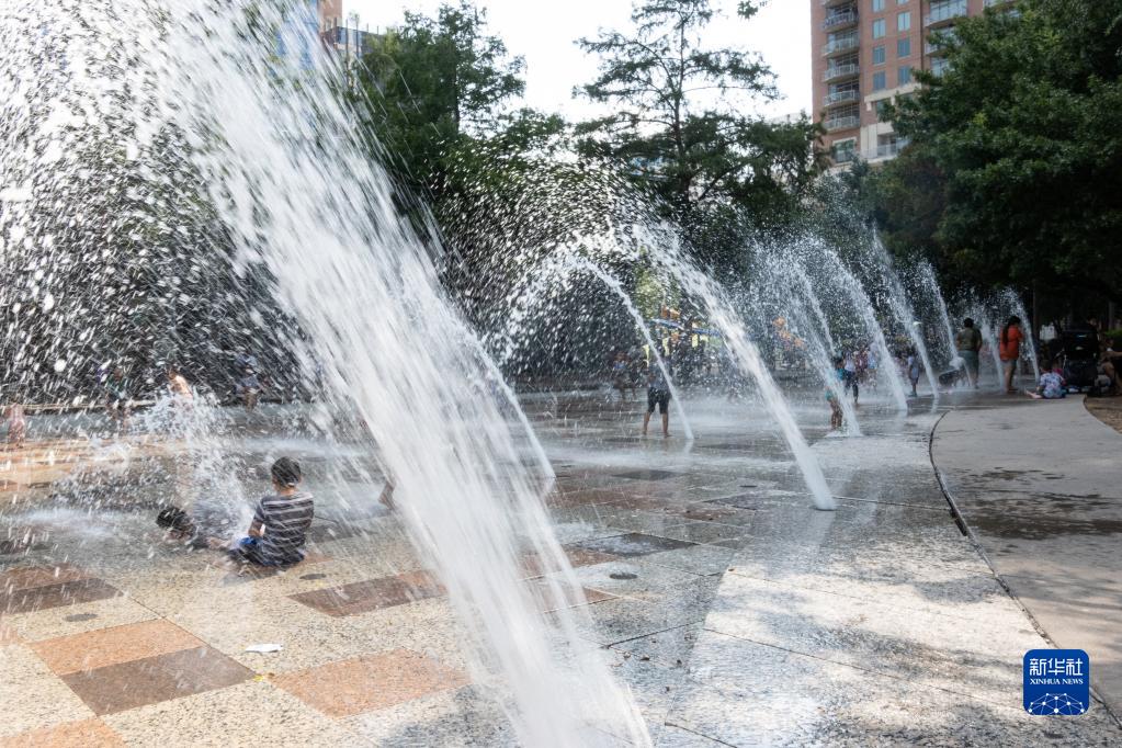 6月15日,孩子們在美國休斯敦市一處噴水公園玩耍消暑。