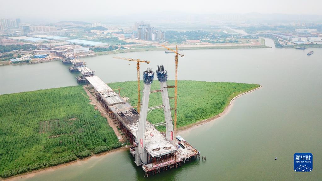 這是6月16日拍攝的香爐洲大橋項目建設現場(chǎng)(無(wú)人機照片)。