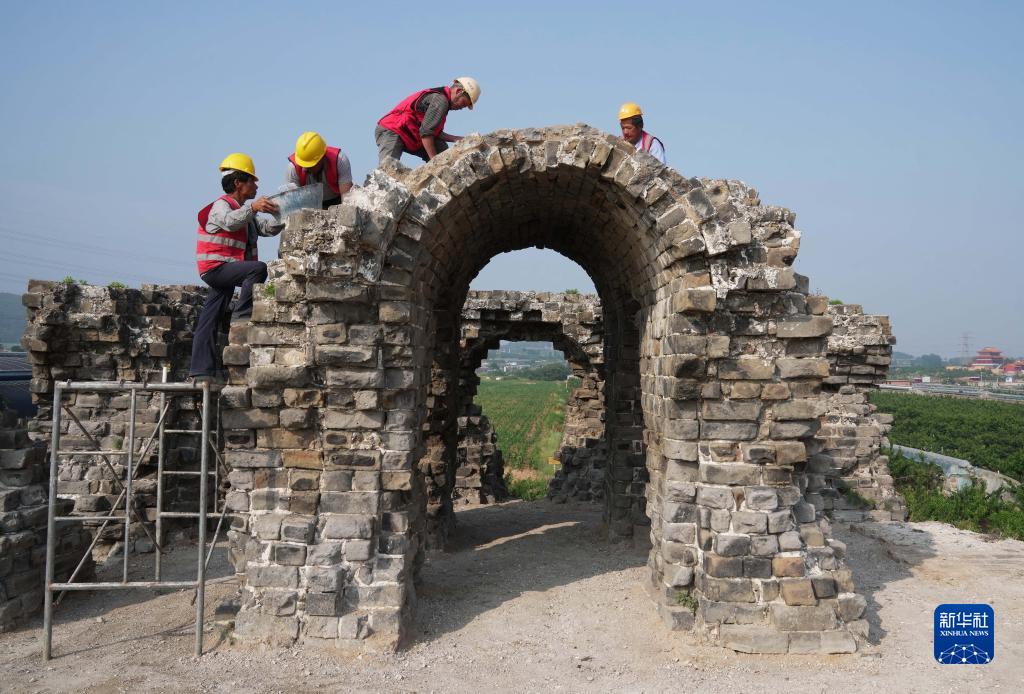 6月15日,工人在山海關(guān)長(cháng)城腰鋪9號敵臺修繕工地施工。