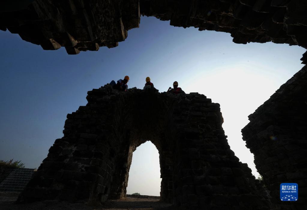 6月15日,工人在山海關(guān)長(cháng)城腰鋪9號敵臺修繕工地施工。
