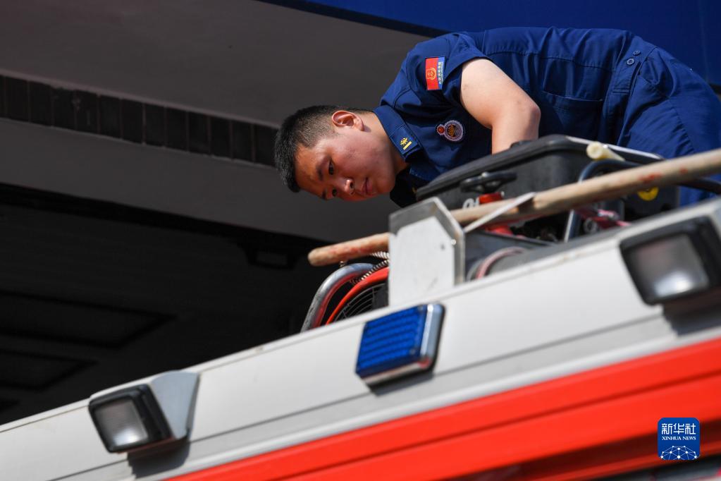 6月17日,在北京市朝陽(yáng)區消防救援支隊紅廟消防救援站,消防員在檢查執勤車(chē)輛裝備,做好執勤戰備、滅火救援準備工作。