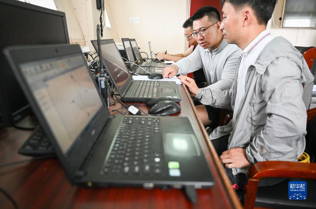 工作人員在“電科1號”綜合試驗船上驗證高低軌衛星、無(wú)人機協(xié)同通信覆蓋能力(6月15日攝)。