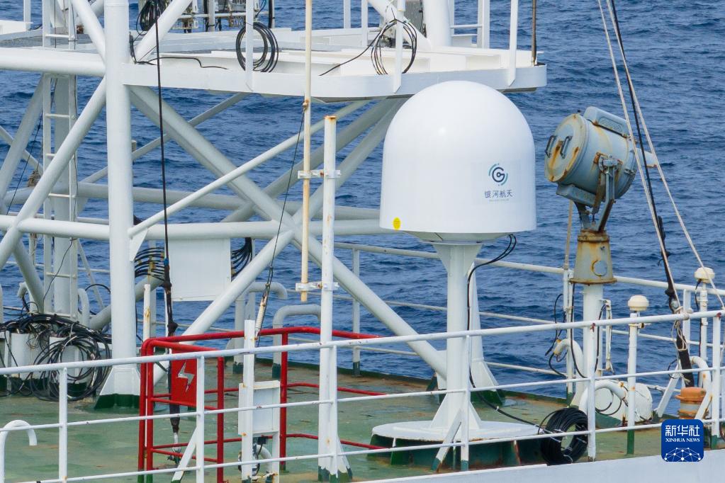 安裝在“電科1號”綜合試驗船上的船載低軌衛星互聯(lián)網(wǎng)終端(無(wú)人機照片,6月15日攝)。在此次測試中,該終端用于與低軌衛星進(jìn)行無(wú)線(xiàn)通信。
