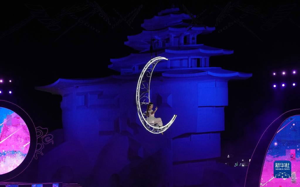6月17日,在秦皇島市北戴河區碧螺塔酒吧公園,演員為游客表演海上實(shí)景奇幻秀《塔秀》。