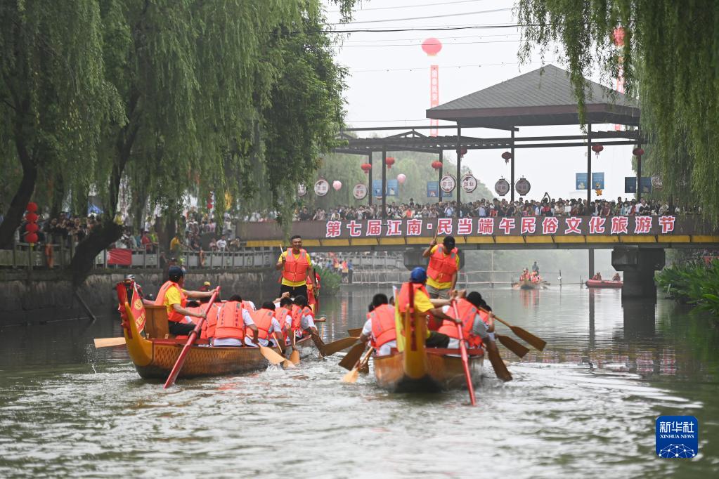 當日,浙江省湖州市“我們的節日·端午”暨第七屆江南·民當端午民俗文化旅游節在南潯區和孚鎮民當村開(kāi)幕,來(lái)自南潯區各個(gè)鄉鎮的農民選手在河道中賽龍舟、劃菱桶,體驗傳統端午民俗。