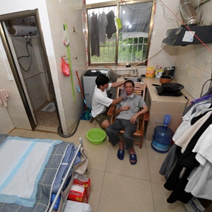 6月17日,在廣西南寧,袁東旺在學(xué)校附近的出租房里幫父親洗臉。