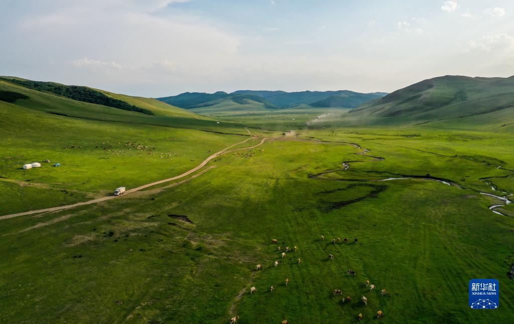 6月16日,額爾敦巴特爾一家趕著(zhù)牛群行走在遷徙路上(無(wú)人機照片)。