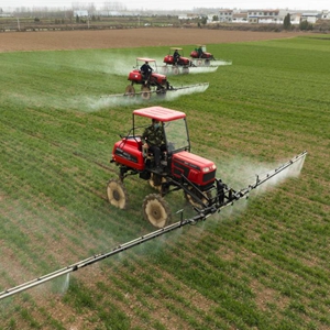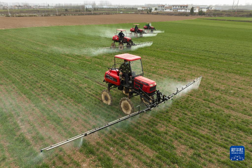 在西安市長(cháng)安區引鎮街道天王村的麥田里,長(cháng)豐農機專(zhuān)業(yè)合作社的自走式噴桿噴霧機在進(jìn)行除草作業(yè)(2月28日攝,無(wú)人機照片)。