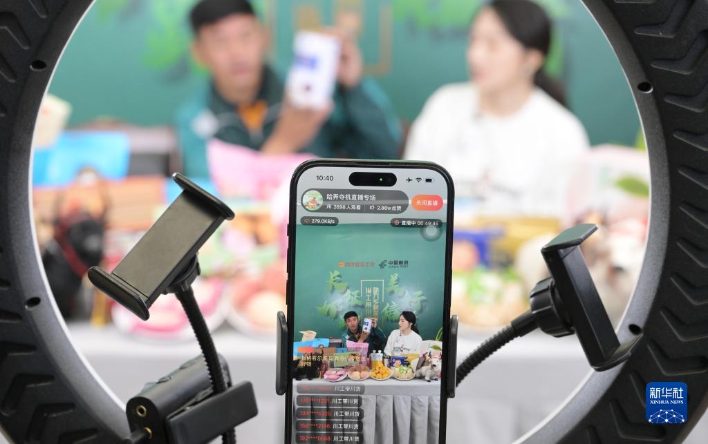 哈弄奪機(左)在郵政電商工作室直播帶貨(6月17日攝)。哈弄奪機在鏡頭前一改往日給人略顯靦腆的印象,說(shuō)起本地的物產(chǎn)如數家珍。