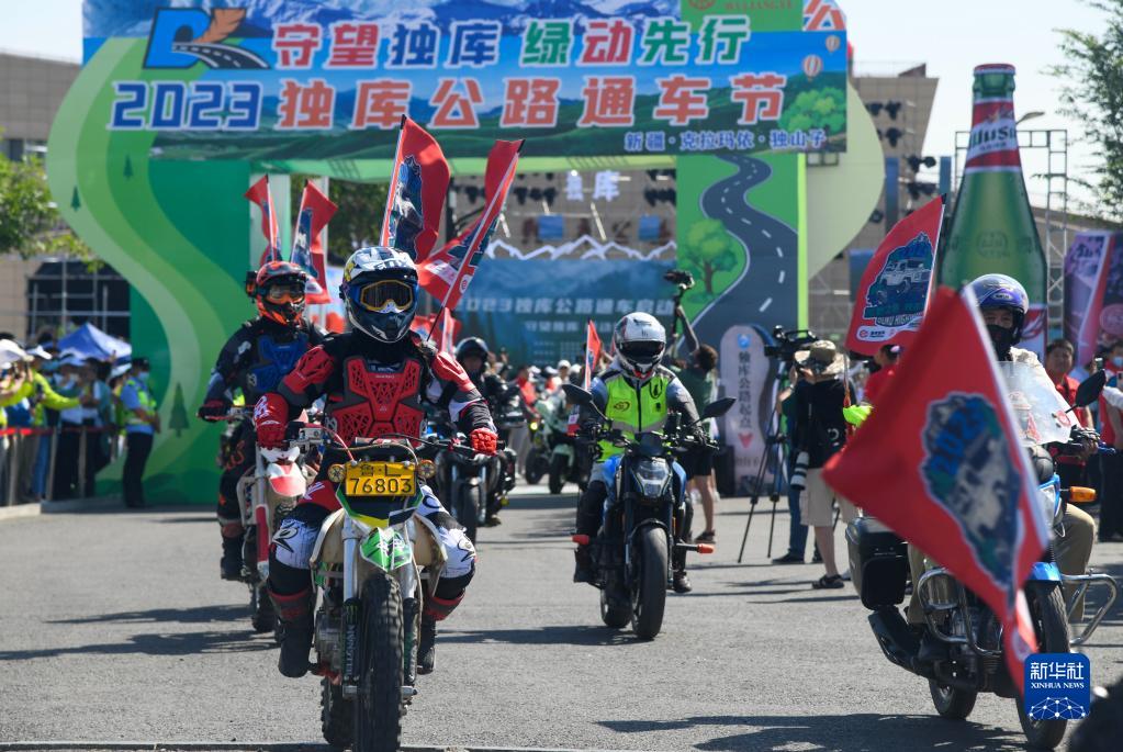 6月18日,在新疆克拉瑪依市獨山子區獨庫大本營(yíng)廣場(chǎng),車(chē)手騎著(zhù)摩托車(chē)準備前往獨庫公路。