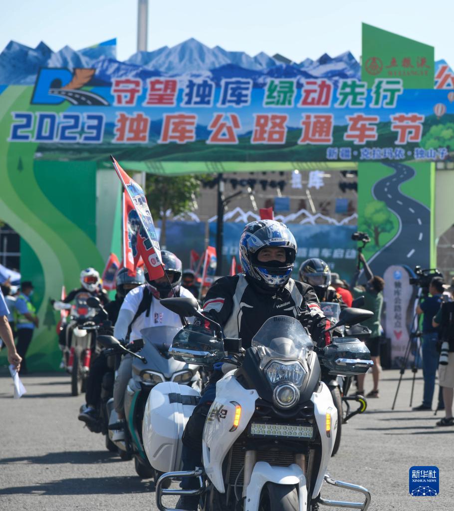 6月18日,在新疆克拉瑪依市獨山子區獨庫大本營(yíng)廣場(chǎng),車(chē)手騎著(zhù)摩托車(chē)準備前往獨庫公路。