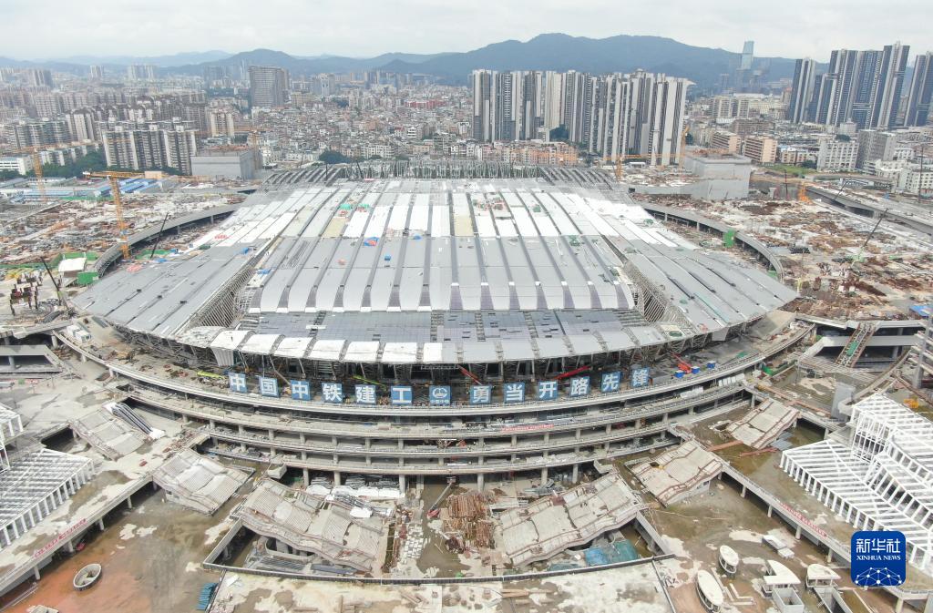 這是6月19日拍攝的建設中的廣州白云火車(chē)站(無(wú)人機照片)。