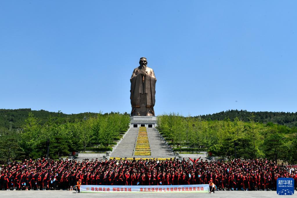 2023年6月8日,在曲阜市尼山圣境,來(lái)自濟南市章丘雙語(yǔ)學(xué)校的同學(xué)參加研學(xué)活動(dòng)并在孔子像前合影留念。