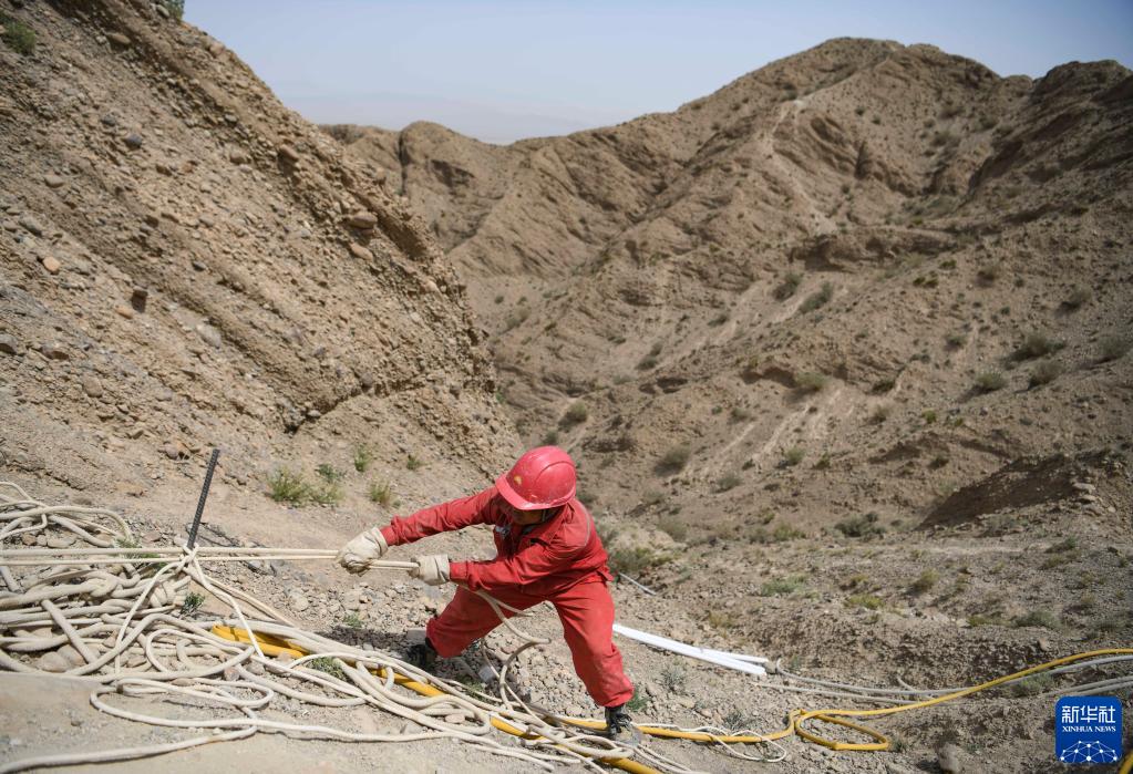 東方物探公司塔里木物探處2170隊的鉆工在山坡上拉拽綁有鉆井設備的繩索(6月18日攝)。新華社記者 胡虎虎 攝