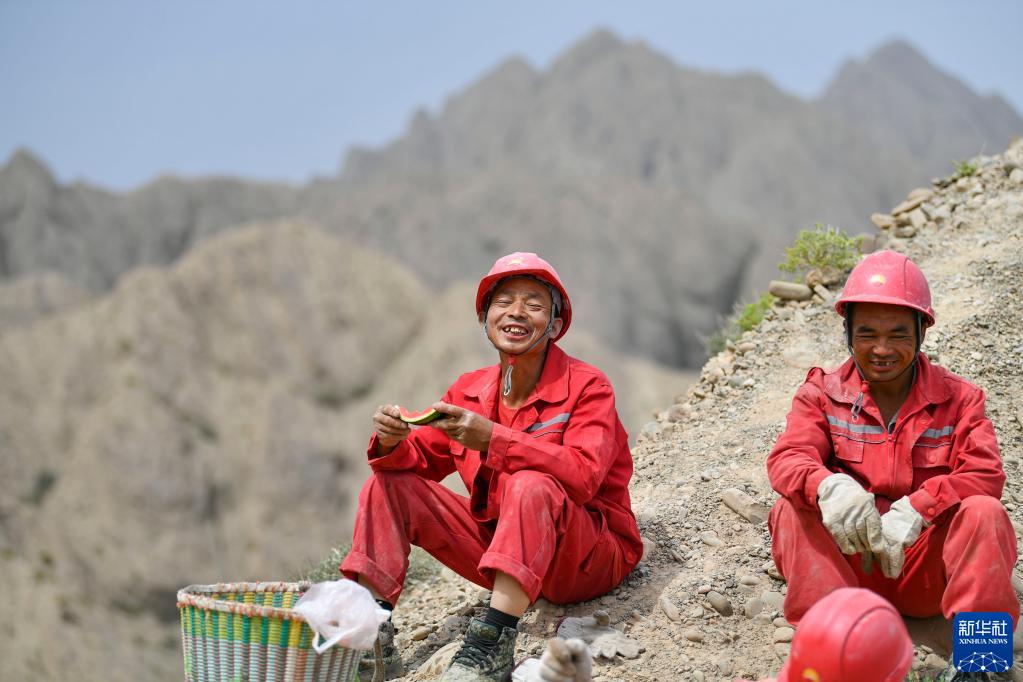耗時(shí)約3個(gè)小時(shí)將全部鉆井設備搬過(guò)一處崖壁后,東方物探公司塔里木物探處2170隊的司鉆李事全(左)、鉆工黃厚林等休息聊天(6月18日攝)。新華社記者 胡虎虎 攝