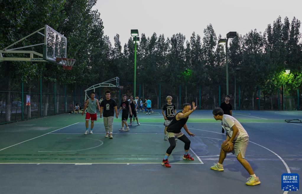 6月20日晚,市民在天津市東麗區體育運動(dòng)中心內的籃球場(chǎng)打籃球。
