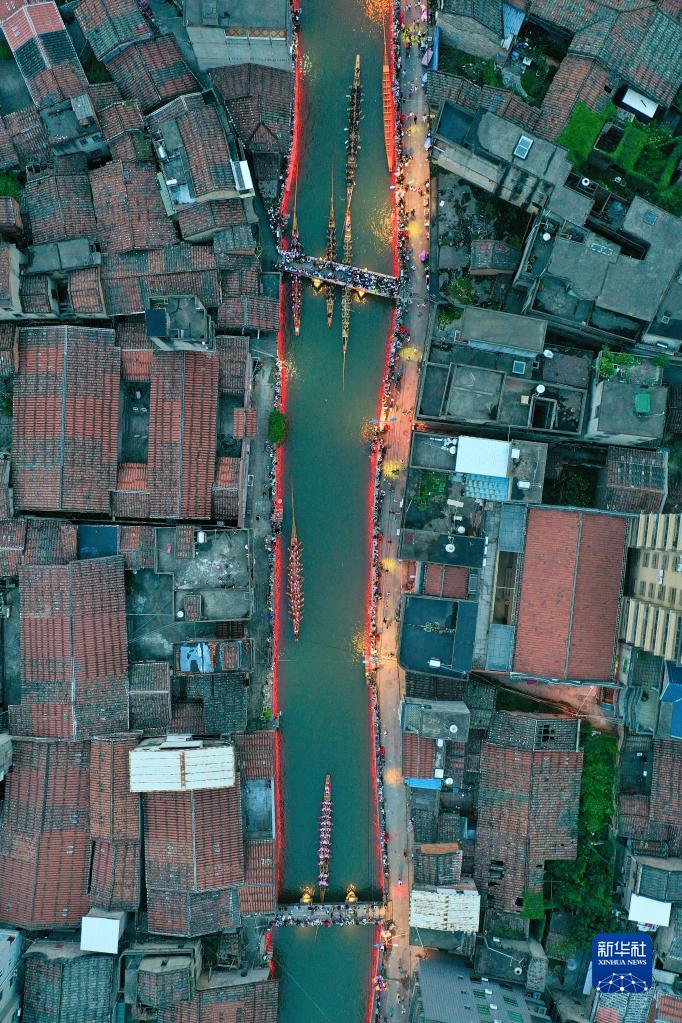 福州市長(cháng)樂(lè )區三溪村,龍舟在穿村而過(guò)的小溪中競渡迎端午(6月18日攝,無(wú)人機照片)。