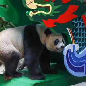 當日,廣州長(cháng)隆野生動(dòng)物世界熊貓館的10余只大熊貓迎來(lái)一個(gè)特別的端午節,它們與游客一起渡龍船、吃粽子,“體驗”一把端午文化的氛圍。