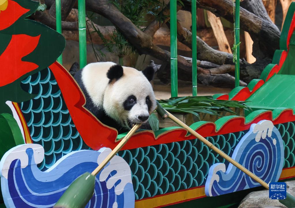 當日,廣州長(cháng)隆野生動(dòng)物世界熊貓館的10余只大熊貓迎來(lái)一個(gè)特別的端午節,它們與游客一起渡龍船、吃粽子,“體驗”一把端午文化的氛圍。