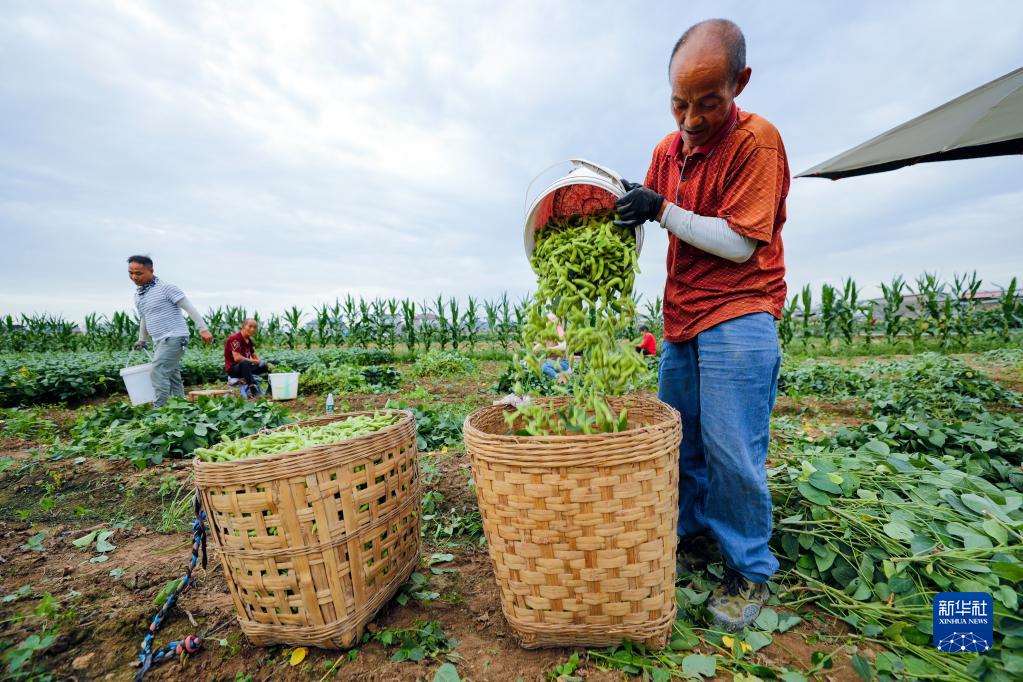 6月19日傍晚,在四川省成都市金堂縣官倉街道中孚社區21組的田地里,人們將采收的毛豆裝入竹筐。