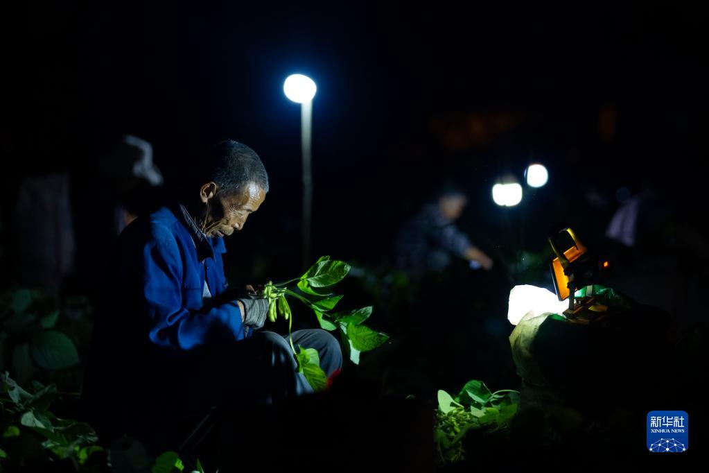 6月19日夜間,在四川省成都市金堂縣官倉街道雙堰社區的田地里,人們借助著(zhù)燈光,抓緊時(shí)間采收毛豆。