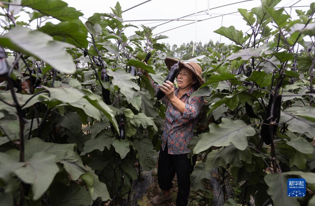 在東風(fēng)堰灌溉區域之一的夾江縣甘江鎮金銀河村,村民在采摘茄子(6月23日攝)。