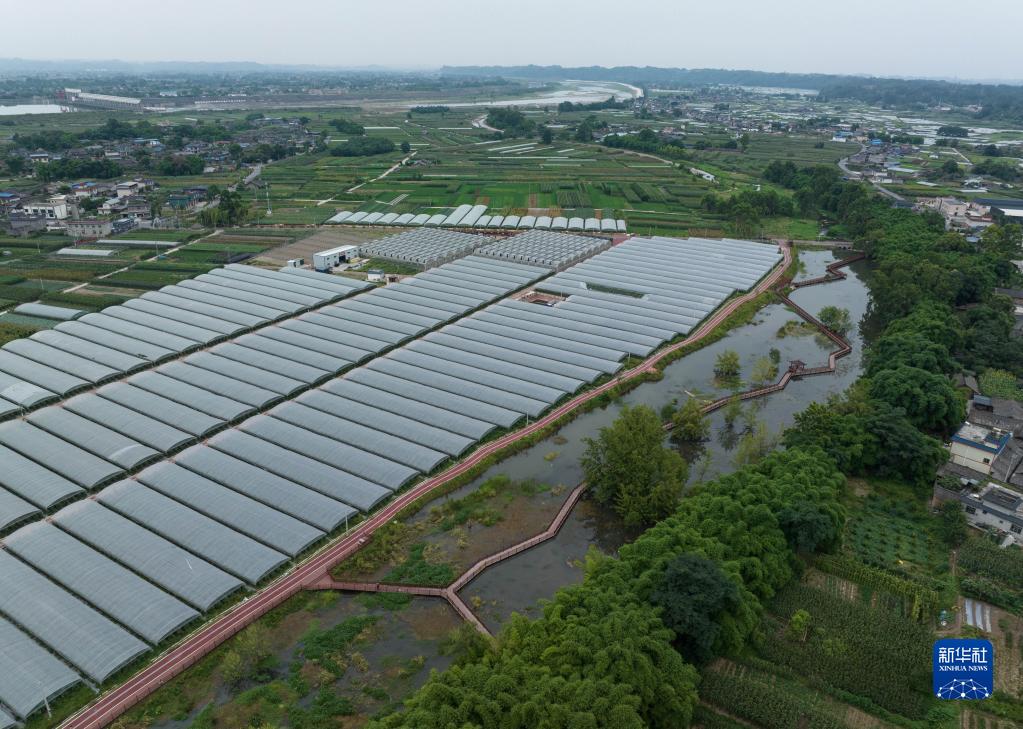 俯瞰東風(fēng)堰灌溉區域之一的夾江縣甘江鎮金銀河村蔬菜大棚(6月23日攝,無(wú)人機照片)。