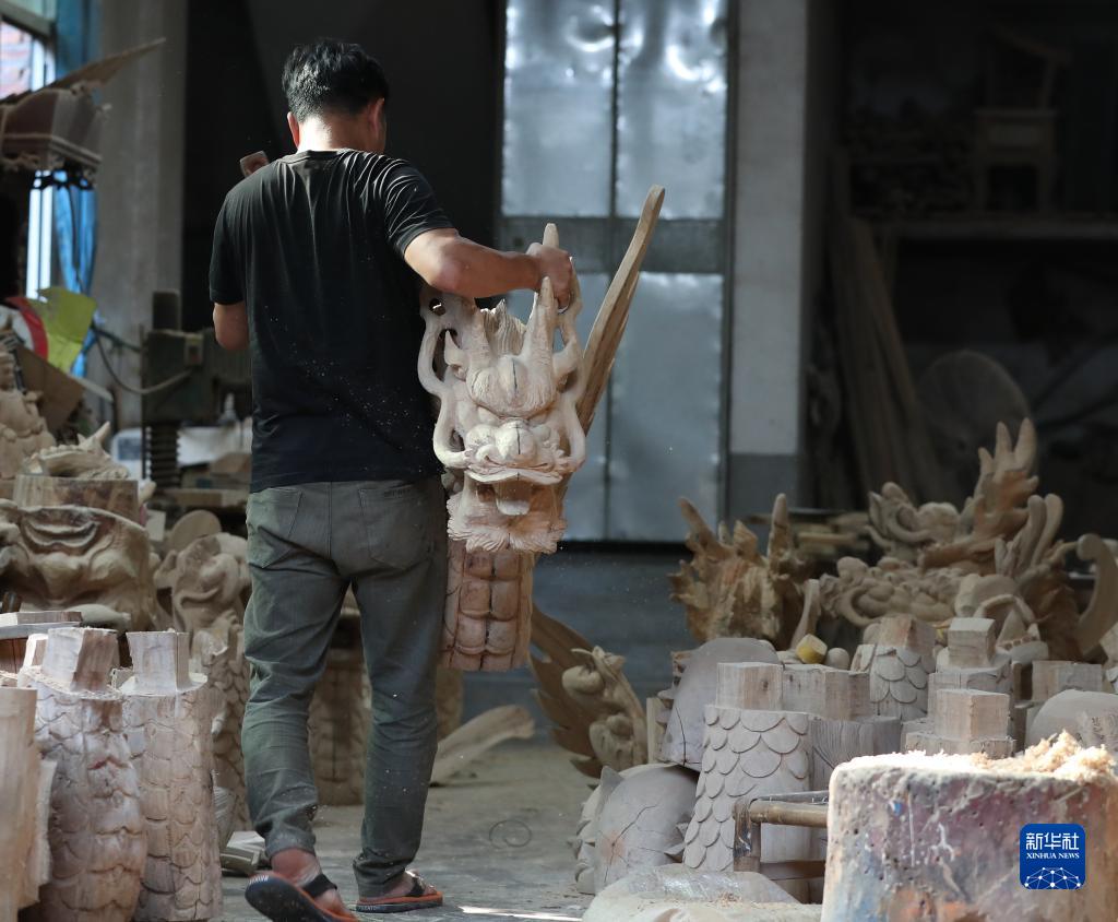 一位匠人在福州市閩侯縣方莊村搬運剛雕刻完成的龍舟龍頭(2023年6月12日攝)。