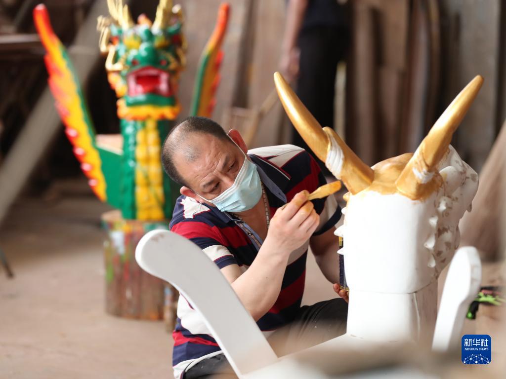 匠人在福州市閩侯縣方莊村為新雕刻的龍舟龍頭上漆(2023年6月12日攝)。