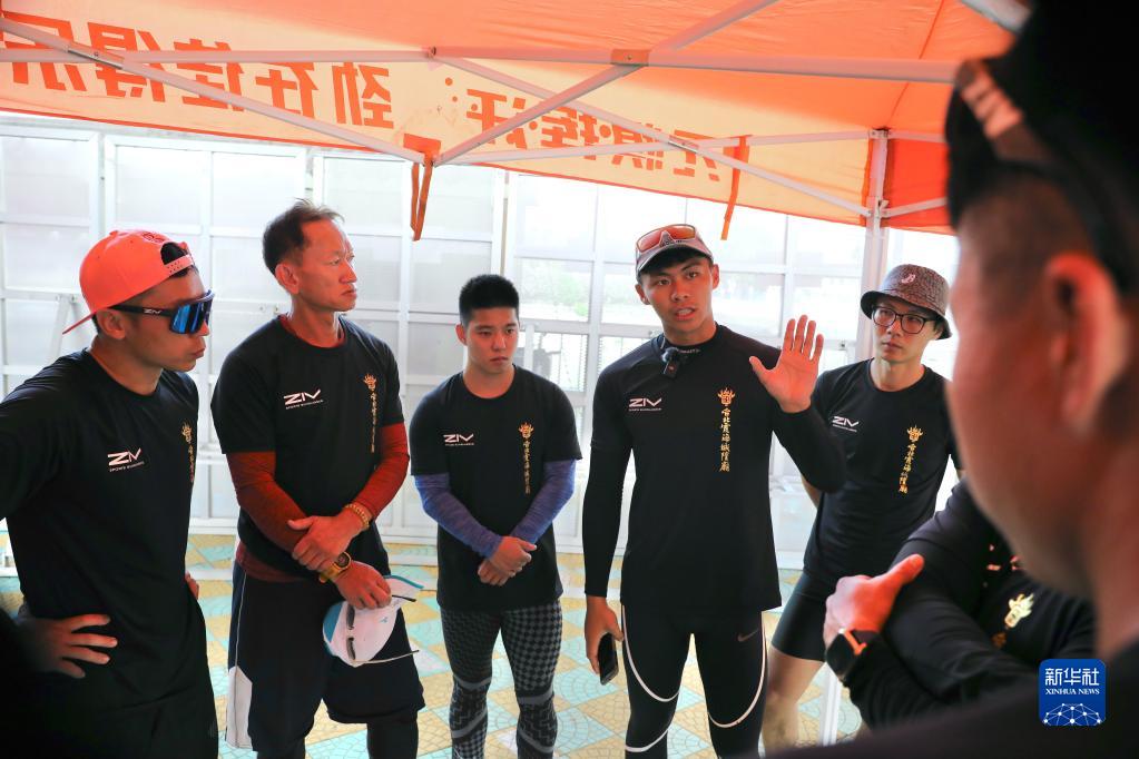 林益宏(左四)在廈門(mén)集美舉行的海峽兩岸龍舟賽上與隊友交流(2023年6月2日攝)。