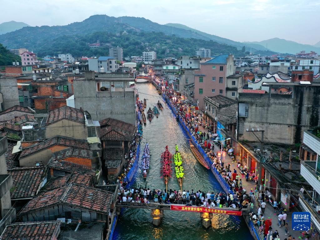 人們在福州市長(cháng)樂(lè )區三溪村穿村而過(guò)的小溪中劃龍舟(2023年6月18日攝,無(wú)人機照片)。