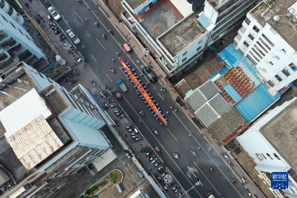 福州市連江縣龍舟愛(ài)好者轉運贈送馬祖鄉親的新龍舟(2023年5月31日攝,無(wú)人機照片)。