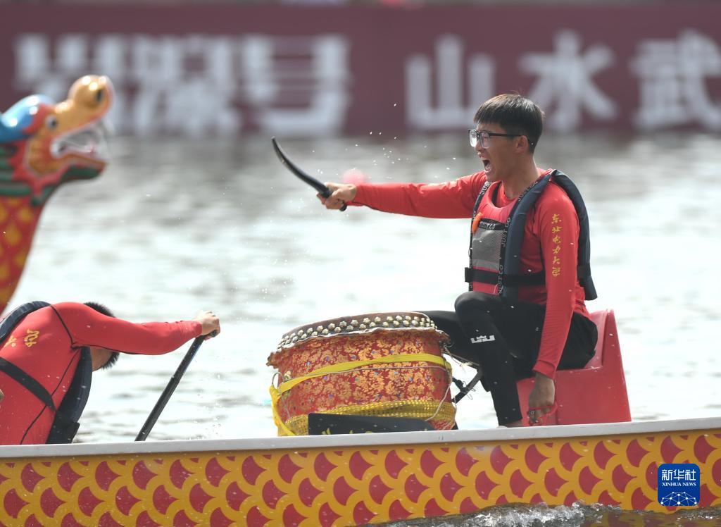 東北電力大學(xué)隊隊員在福州海峽國際會(huì )展中心浦下河段龍舟池舉行的中華龍舟大賽(福建·福州站)中擊鼓(2023年6月22日攝)。