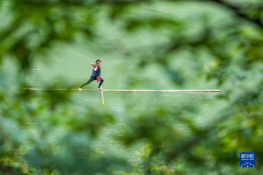 6月22日,獨竹漂表演者在貴州省畢節市九洞天景區表演。