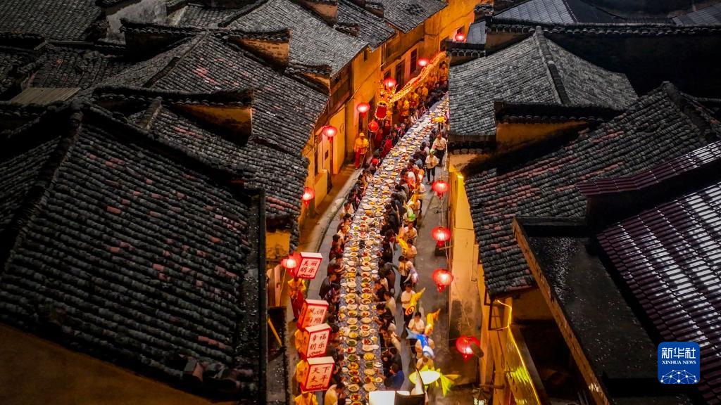 6月16日,村民舞著(zhù)龍燈經(jīng)過(guò)安徽省寧國市胡樂(lè )鎮老街上舉辦的長(cháng)桌宴(無(wú)人機照片)。