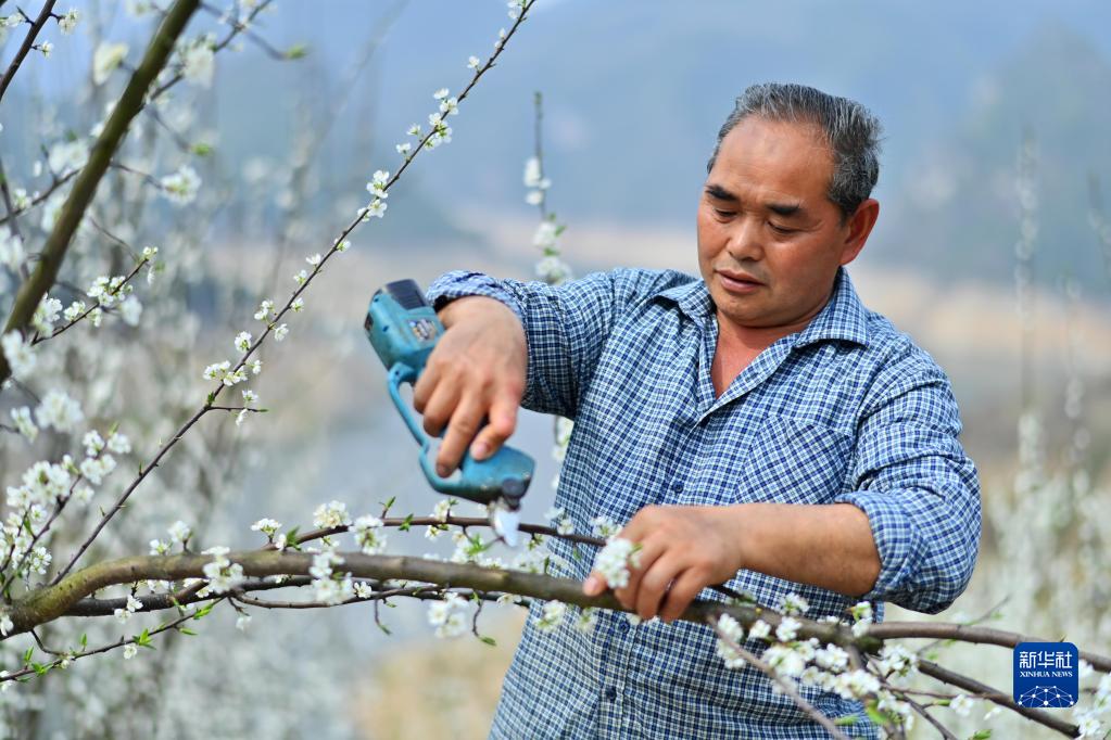 夏國剛在貴州省開(kāi)陽(yáng)縣龍水鄉龍溪村烏江河畔的果園為蜂糖李樹(shù)疏花(3月10日攝)。