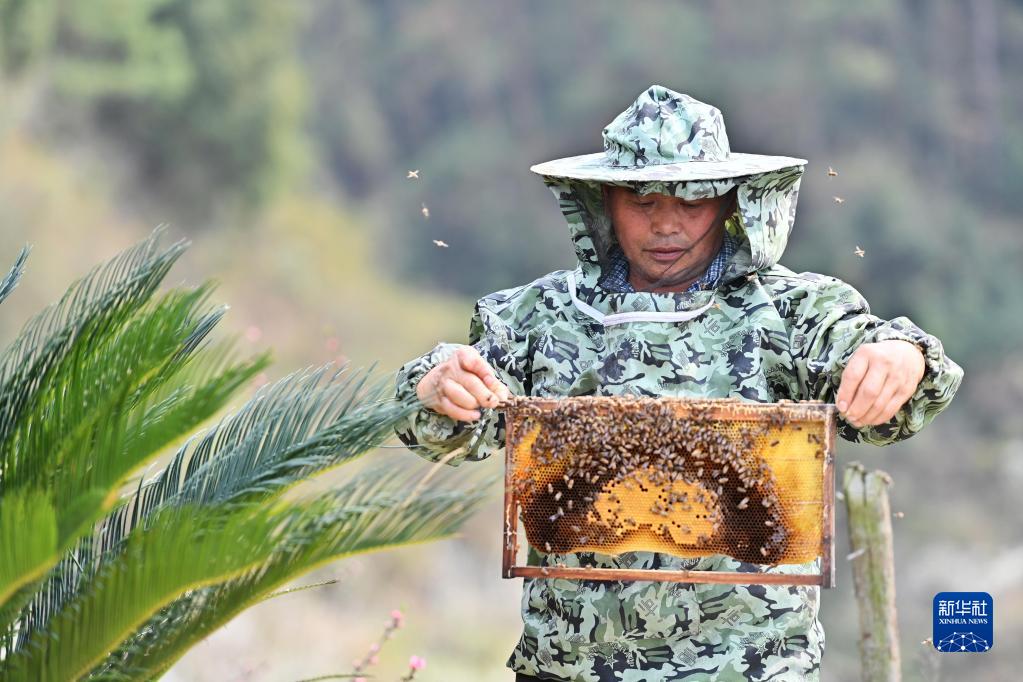 夏國剛在貴州省開(kāi)陽(yáng)縣龍水鄉龍溪村烏江河畔的果園查看蜜蜂產(chǎn)蜜情況(3月10日攝)。